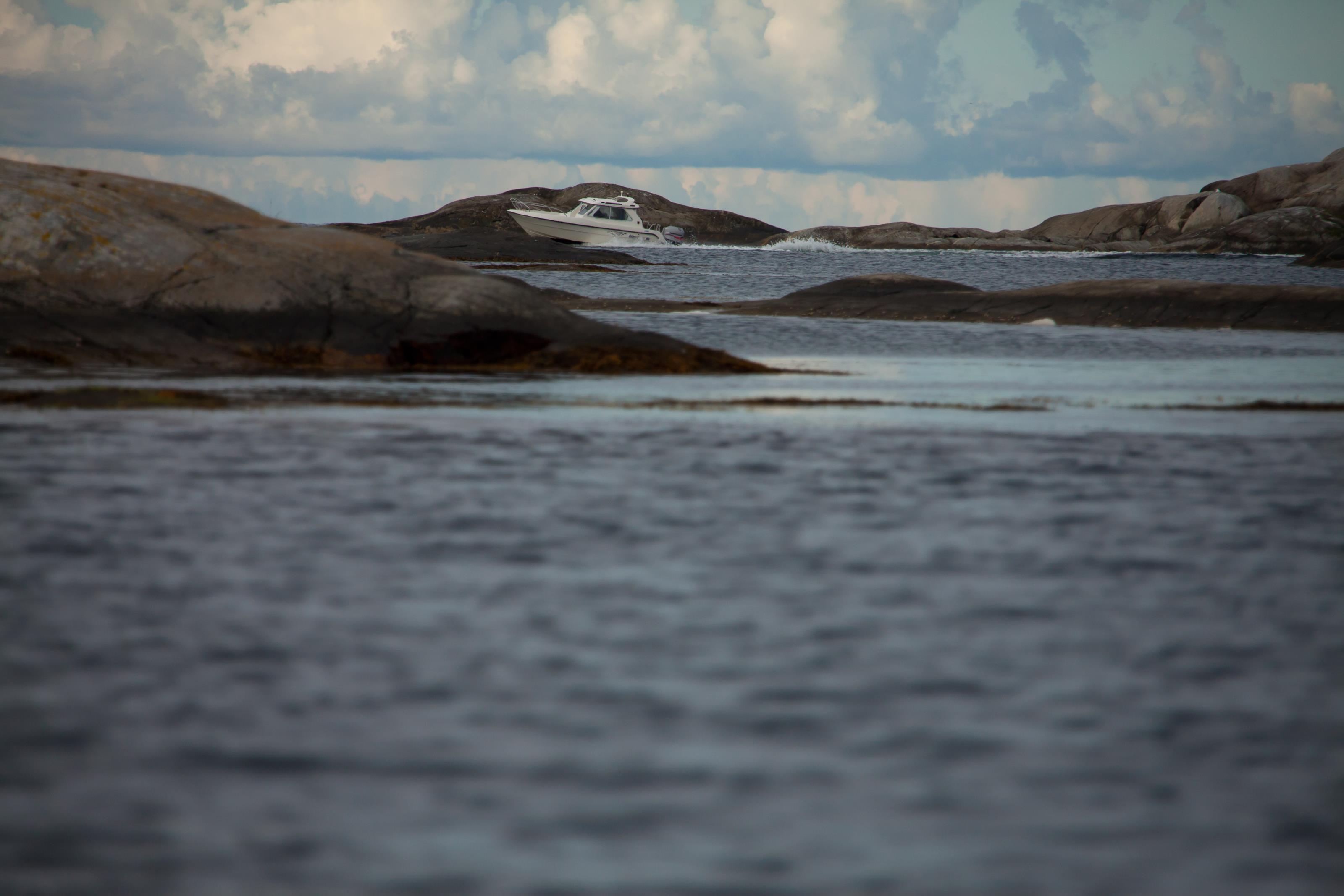 En båt bland skären på västkusten. På detta foto kan associeras till: berg, hav, havet, klippor, vatten, västkusten, .