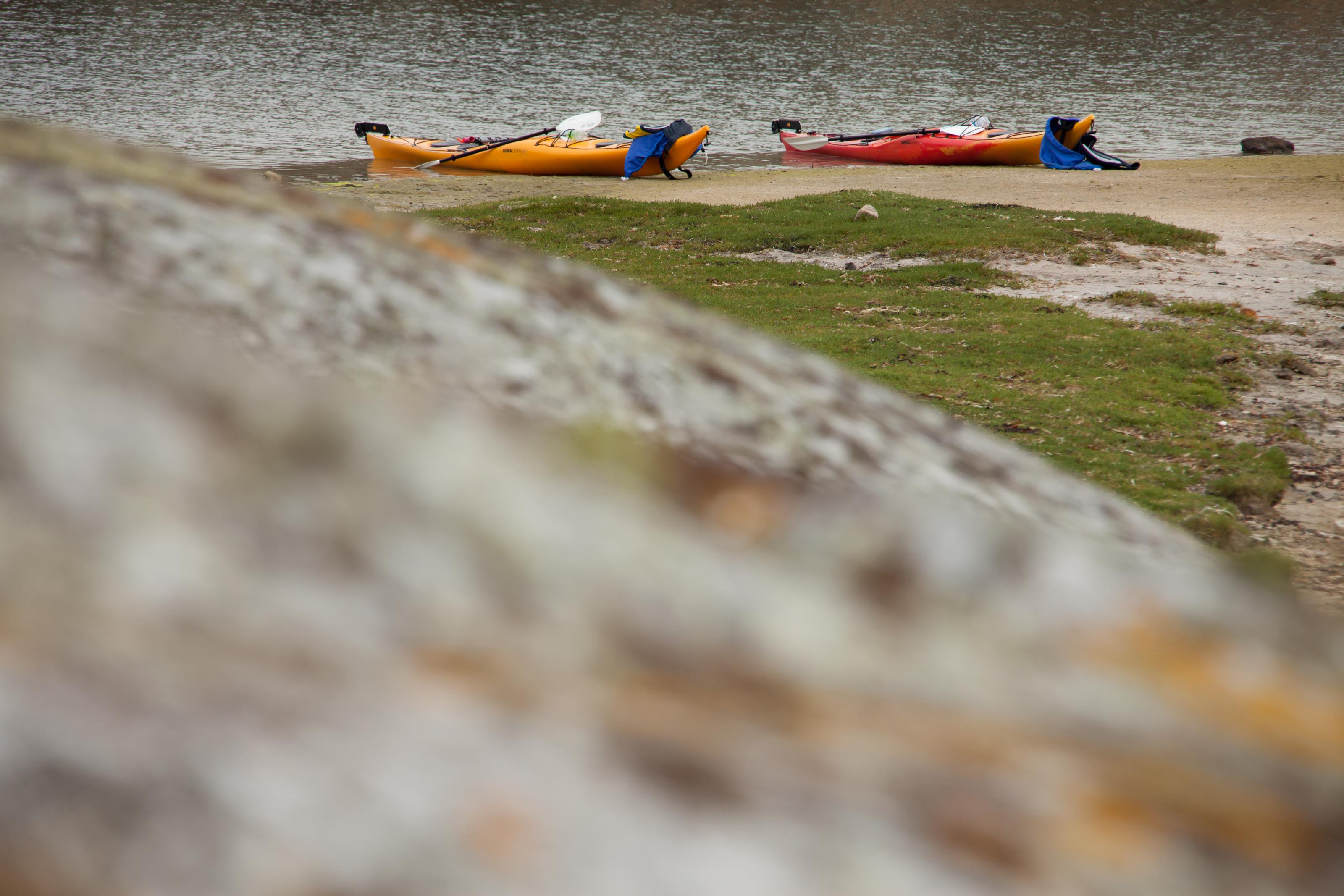 Två stycken kajaker ligger uppdragna på stranden. På detta foto kan associeras till: härmanö, kajak, kajaker, padla, västkusten, .
