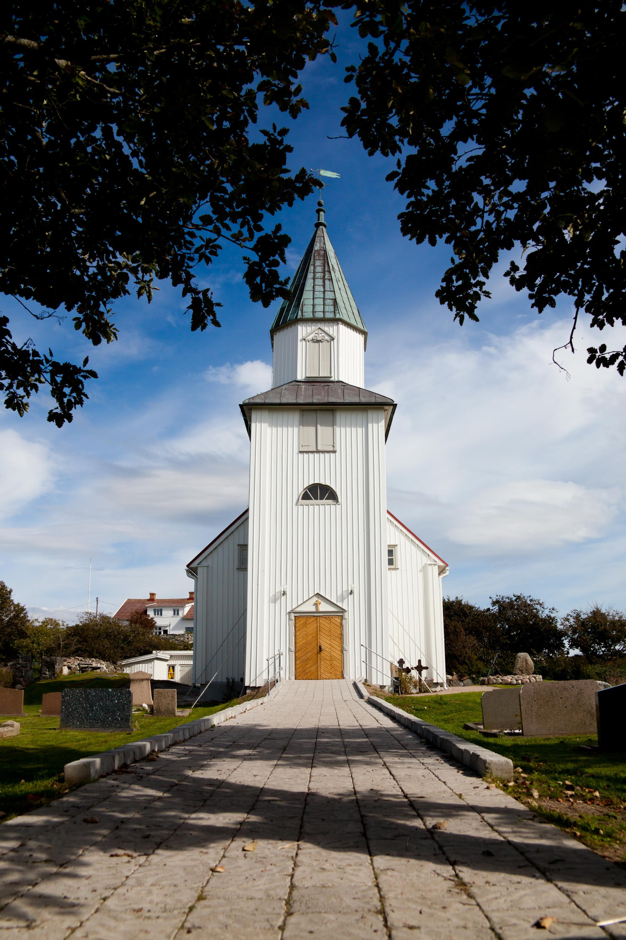 Käringöns kyrka, en vacker vit träkyrka. På detta foto kan associeras till: kyrka, kyrkogård, käringön, kärringöns, orust, västkusten, .