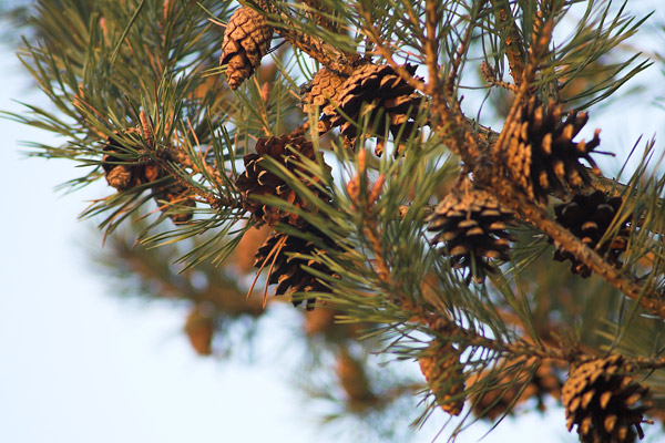 Kottar som hänger i trädet. På detta foto kan associeras till: kottar, träd, barr, natur, kotte, himmel, kvistar.