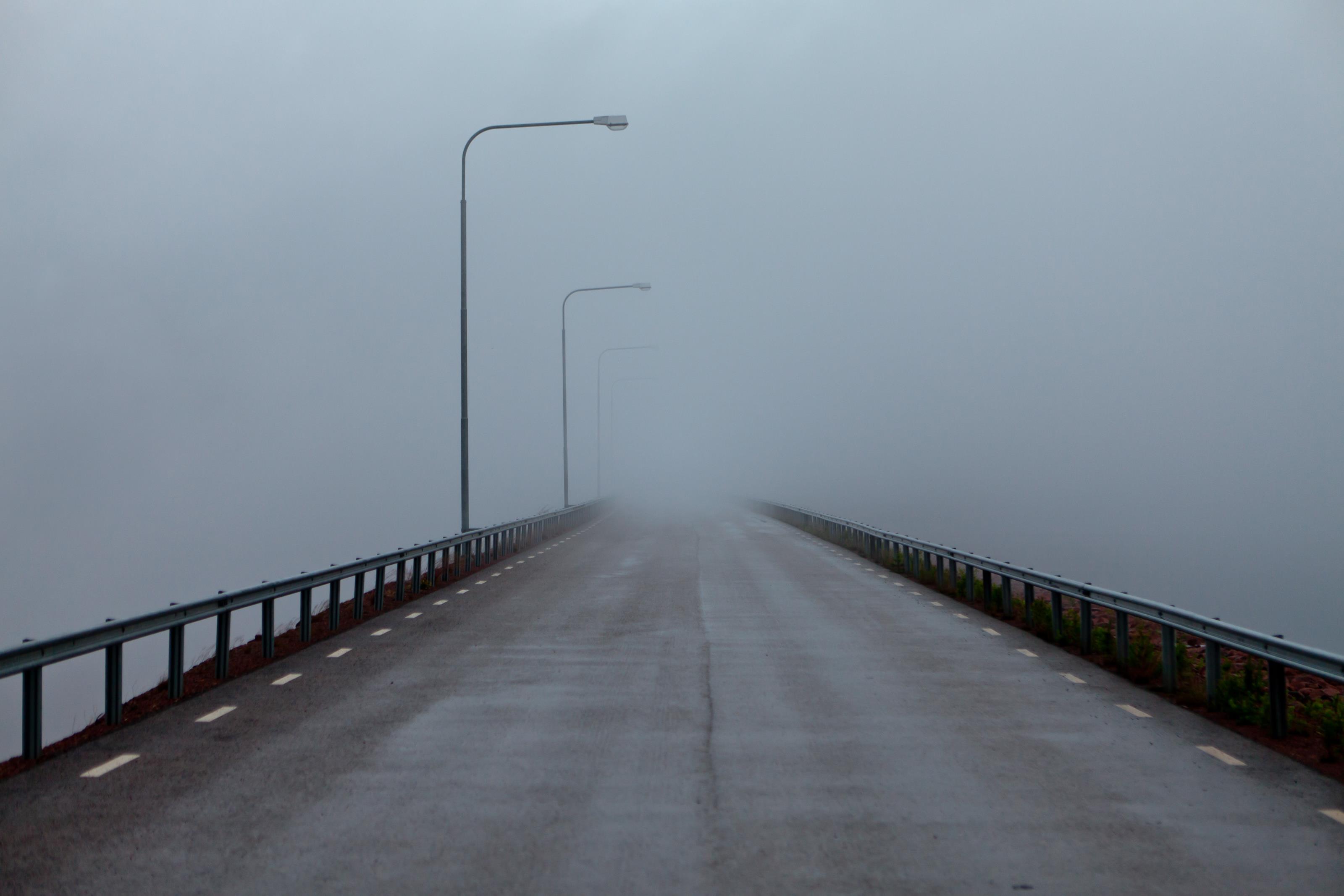 Dimma över en bro. På detta foto kan associeras till: bro, dalarna, räcke, trafikmiljö, väg, vägräcke, älvdalen, .