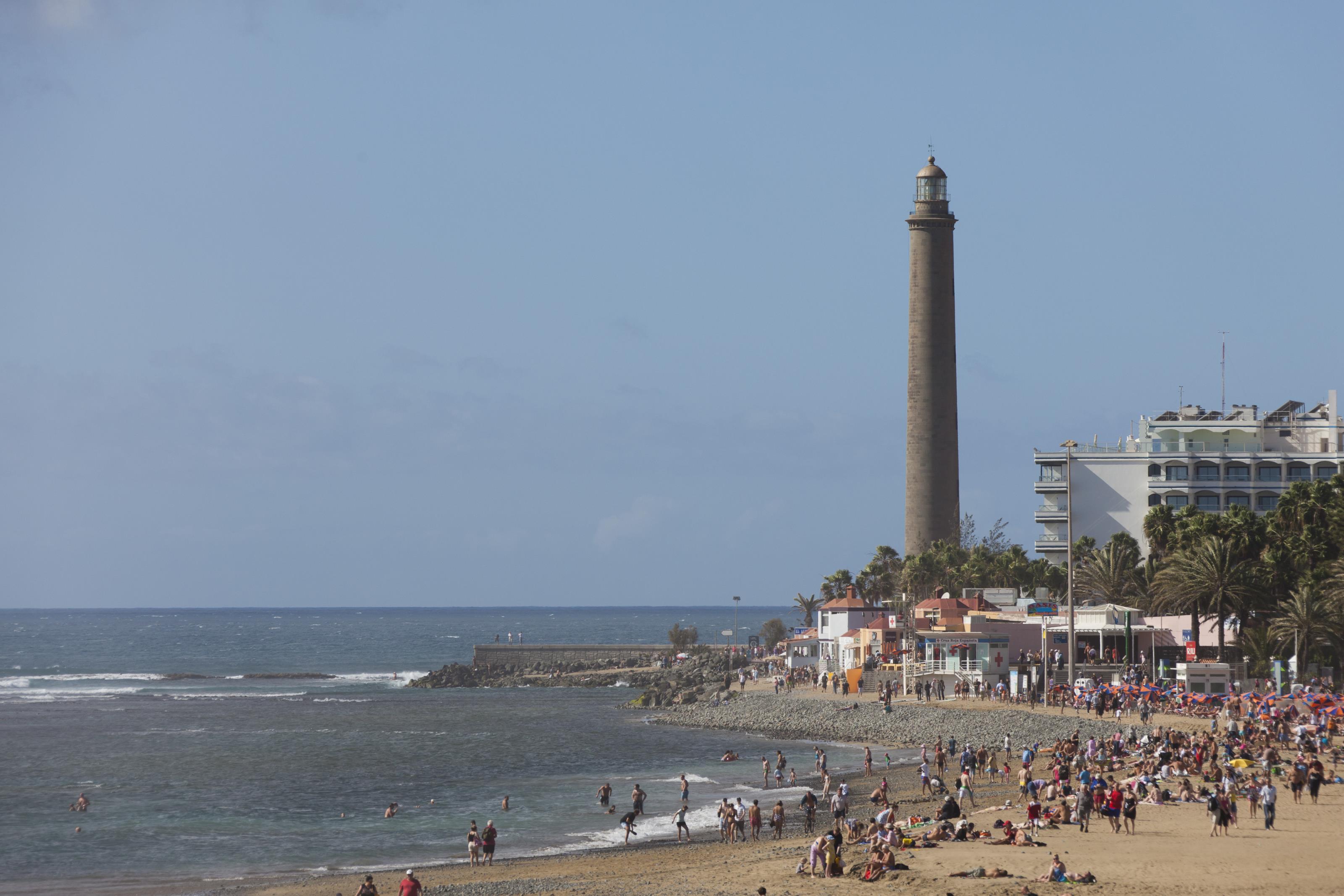 Badstand vid Maspalomas på Gran Canaria. På detta foto kan associeras till: atlanten, bada, badstrand, faro, de, fyr, gran, canaria, hav, havet, kanarieöarna, kust, kusten, maspalomas, parasoll, resmål, semester, semesterresa, solresa, solsemester, spanien, strand, turist, turister, vatten, vågor, .