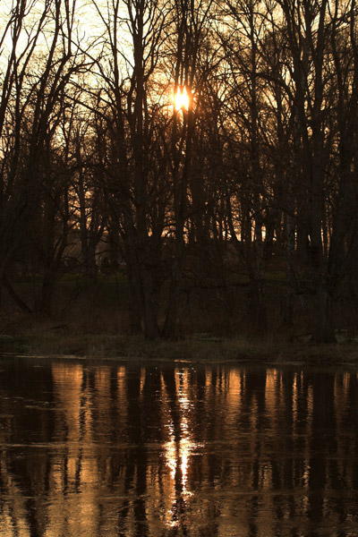 Solen går ned bakom träden och solen reflekteras i vattnet. På detta foto kan associeras till: refex, reflektera, sol, soljus, blänk, solnedgång, röd, vatten, träd.