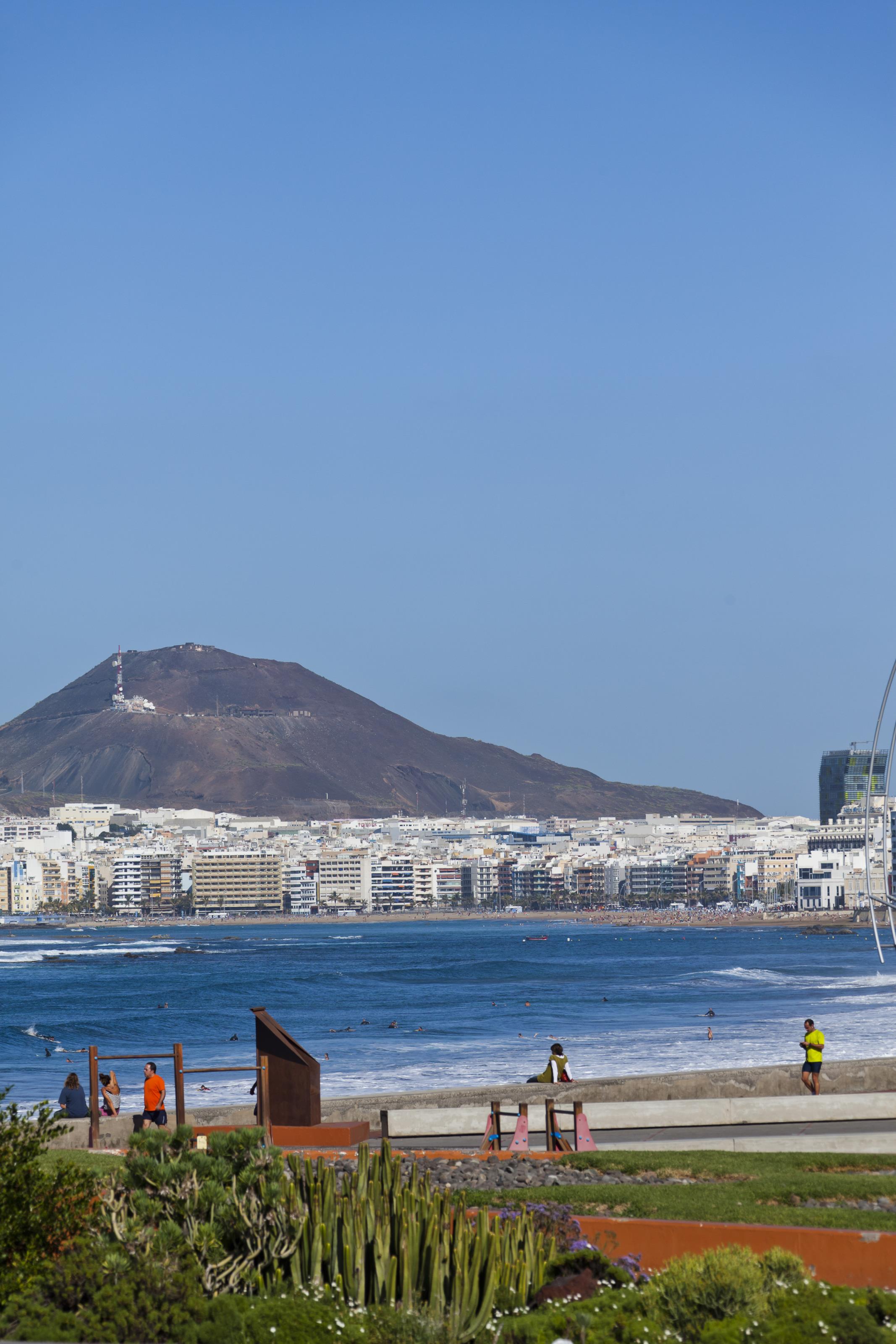 Stranden Las Canteras i Las Palmas på Gran Canaria. På detta foto kan associeras till: atlanten, gran, canaria, hav, havet, kanarieöarna, kust, kusten, las, canteras, las, palmas, playa, resmål, semester, semesterresa, solresa, solsemester, spanien, strand, turist, turister, vatten, vågor, .