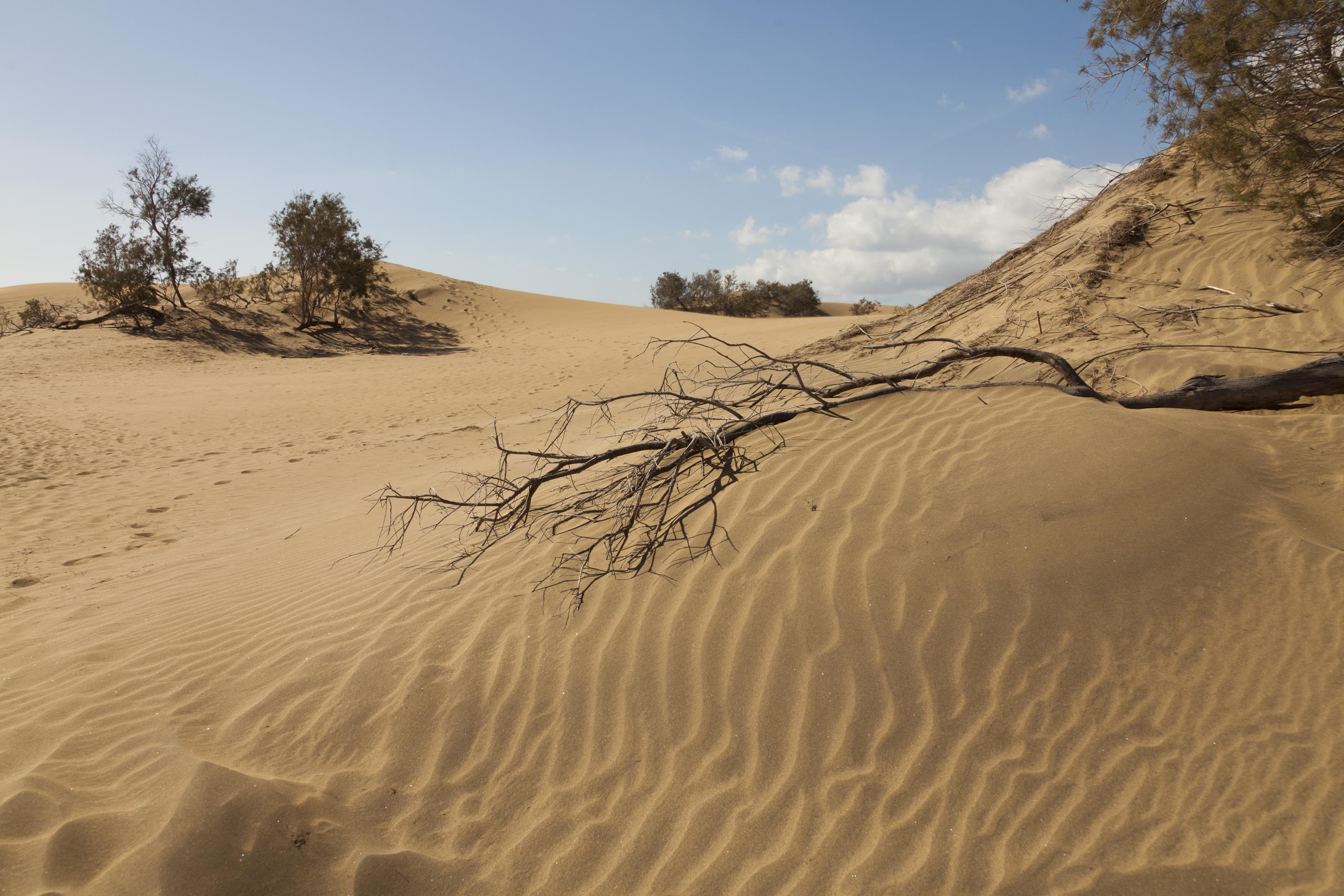 Karg miljö i Maspalomas öken. På detta foto kan associeras till: gran, canaria, hett, kanarieöarna, kargt, maspalomas, sand, sanddynor, sol, soligt, sommar, spanien, varmt, värme, öken, öknen, .