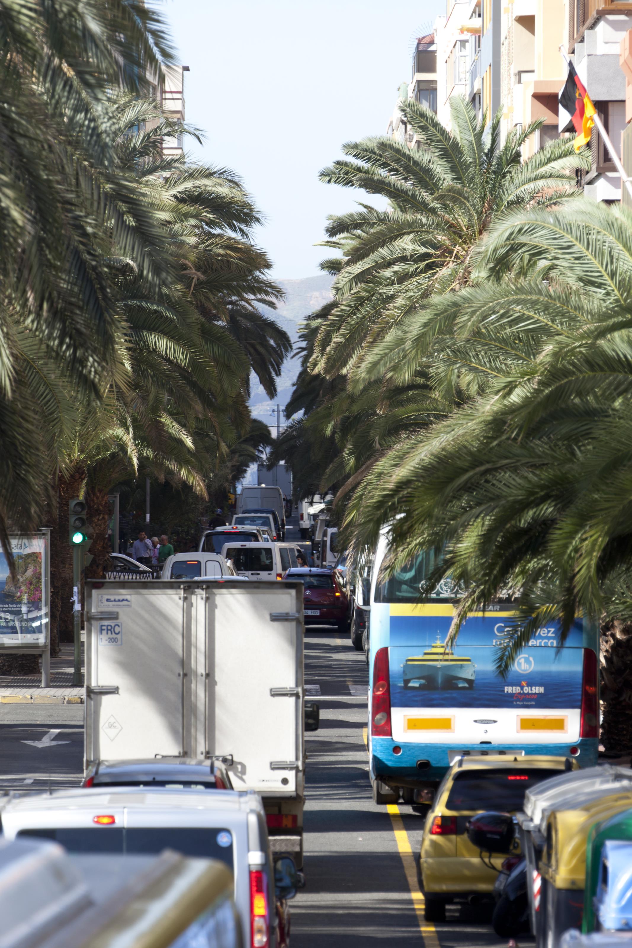 Trafikkaos inne i centrala Las Palmas, Gran Canaria. På detta foto kan associeras till: byggnad, byggnader, gran, canaria, kanarieöarna, kaos, las, palmas, palm, palmer, spanien, stad, stadsmiljö, städer, trafik, trafikkaos, trafikmiljö, träd, .