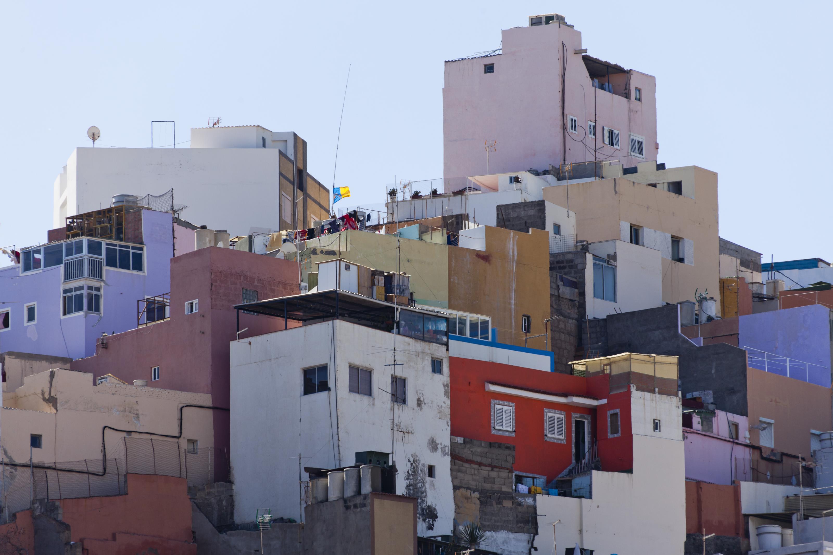 Bostadshus på ett berg i Las Palmas, Gran Canaria. På detta foto kan associeras till: byggnad, byggnader, gran, canaria, kanarieöarna, las, palmas, spanien, stad, stadsmiljö, städer, .