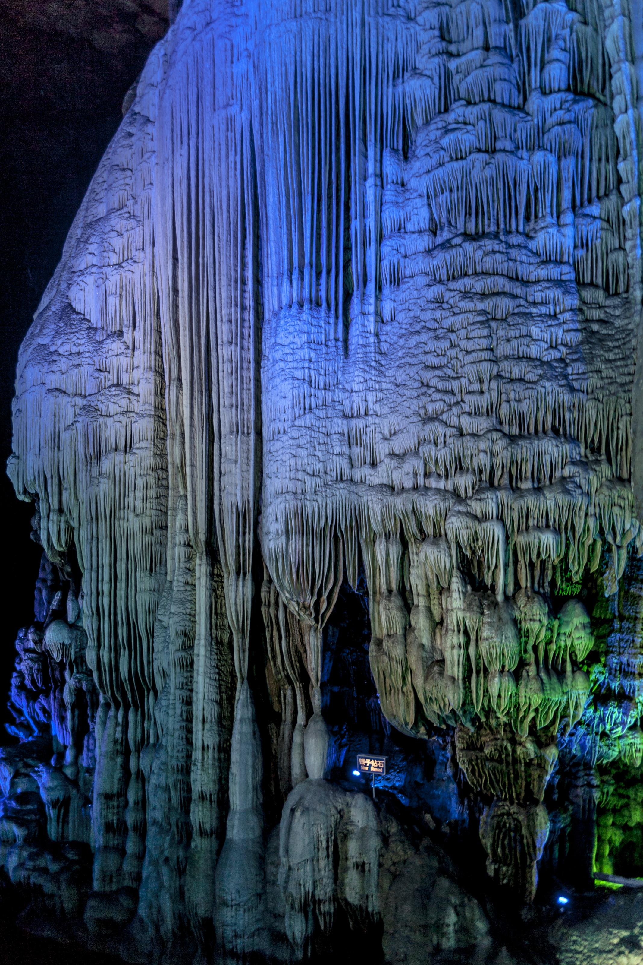 Den upplysta Silvergrottan i Yangshuo, Kina. På detta foto kan associeras till: asien, belysning, färg, färger, grotta, grottor, kina, ljus, silver, silver cave, silvergrottan, stalagmit, stalagtit, yangshuo.