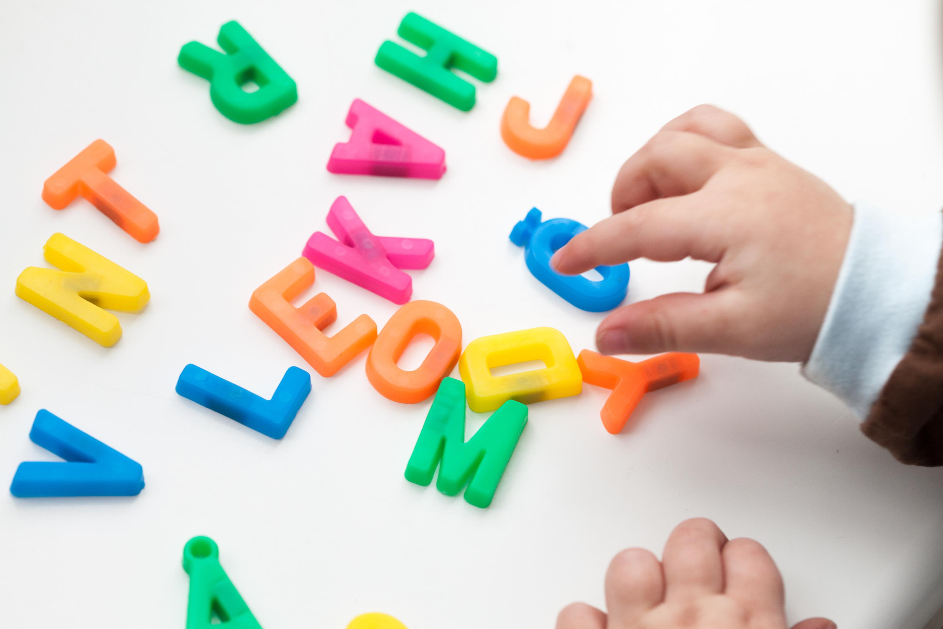 Ett litet barn leker med olika bokstäver i olika färger. På detta foto kan associeras till: barn, barnlek, barnlekar, bokstäver, färg, färger, hand, lek, leka, ord, roligt, skriva, fritid.